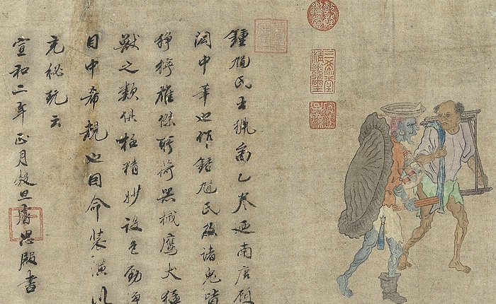 宋徽宗行书御题:钟馗氏出猎图乙卷,迺南唐顾闳中笔也。作钟馗氏及诸鬼,皆狰狞雄杰,所荷器械鹰犬猛兽之类,具极精妙,设色劲净,目中希覩也,因命装潢以充秘玩云。宣和二年正月谷旦,睿思殿书。