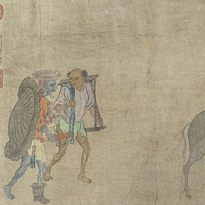 本幅以白描法画钟馗簪花骑驴,偕同鬼卒二十余,浩浩荡荡地护送小妹出嫁。鉴于鬼卒们所持诸物,多蕴涵有祥瑞的寓意;加以画法与王振鹏细密工整的作风不似,因而推测“钟馗嫁妹”应属后代画家的托名之作。