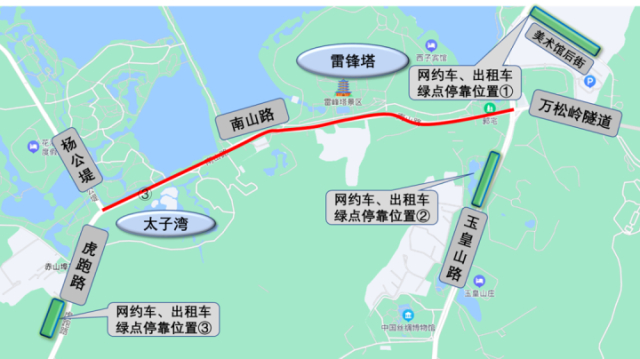 前往西湖南线景区南山路(玉皇山路至杨公堤段)的网约车、出租车需在南山路美术馆后街、玉皇山路和虎跑路三台山路口(赤山埠停车场门口)进行上下客。