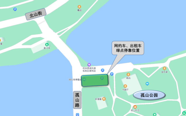 前往西湖北线孤山景区的网约、出租车,需在孤山景区观光车停靠点(西泠桥孤山公园门口停车场)进行上下客点。