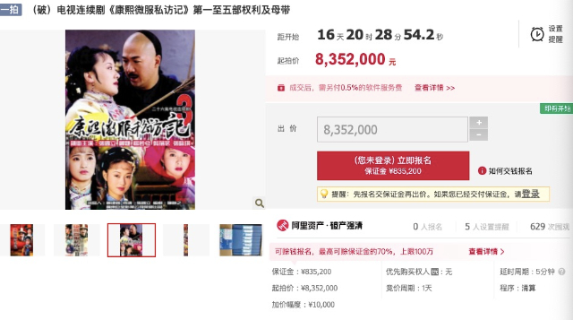 6月3日,第一财经记者注意到,近日,电视连续剧《康熙微服私访记》第一至五部权利及母带已在阿里巴巴司法拍卖网络平台挂出,将于6月20日上午10时起拍,起拍价835.2万元。