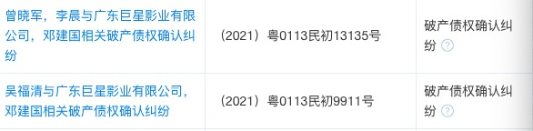 截至目前,广东巨星影业有限公司已涉多个开庭公告,案由多与破产债权确认纠纷相关。天眼查资料显示,最近的一起在2022年3月2日开庭,原告为曾晓军、李晨,被告为广东巨星影业有限公司及该公司总裁邓建国。