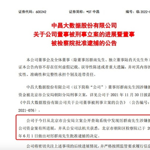 6月2日晚间,*ST中昌公告称,公司董事厉群南因涉嫌挪用资金被北京市公安局朝阳分局刑事立案后,公司从公安司法机关获悉,北京市朝阳区检察院于2022年6月1日做出对厉群南批准逮捕的决定。