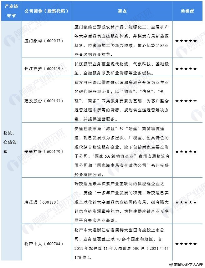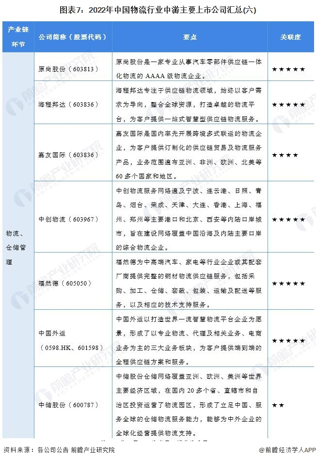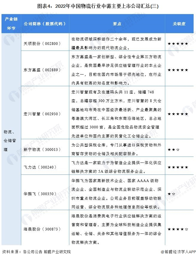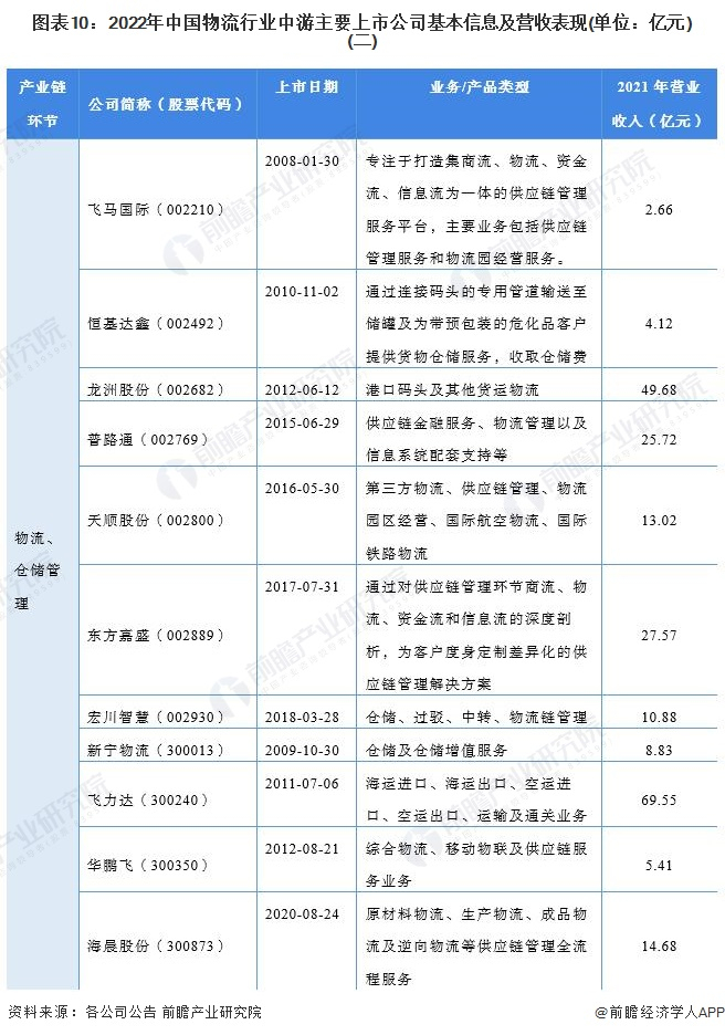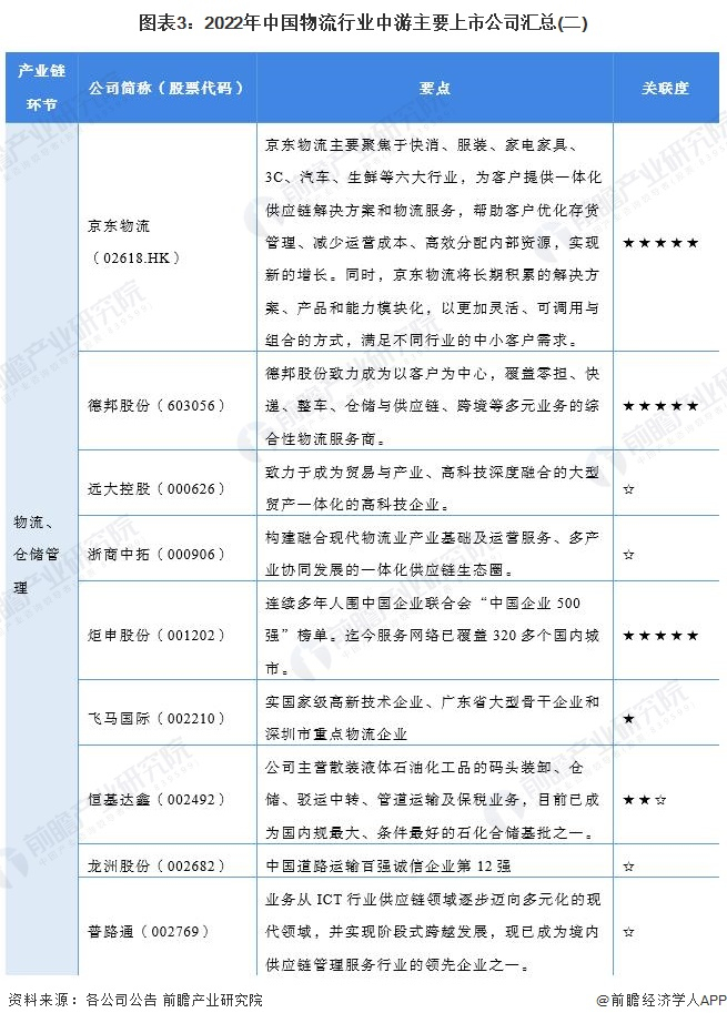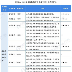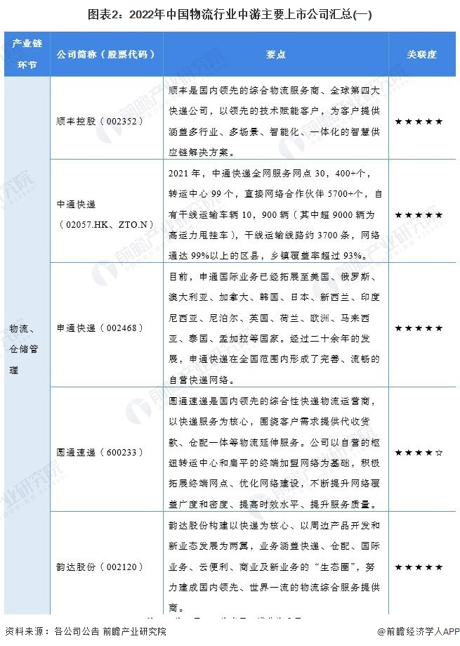 我国物流产业的上市公司数量较多,分布在各产业链环节。目前,我国物流行业上游主要上市公司有:音飞储存、润邦股份和天桥起重等;中游主要上市公司有:顺丰控股、中通快递、申通快递、圆通速递、韵达股份和德邦股份等。截至2022年5月20日,我国物流行业主要上市企业汇总如下: