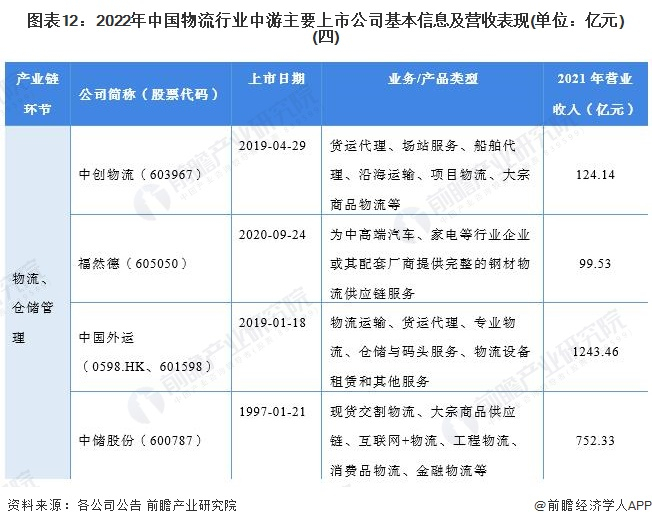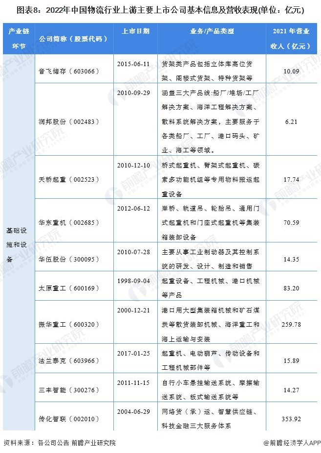 2022年,中国物流行业上游主要上市公司基本信息及营收表现汇总如下: