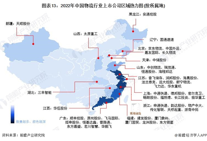 截至2022年5月20日,中国物流行业主要上市公司区域分布如下:
