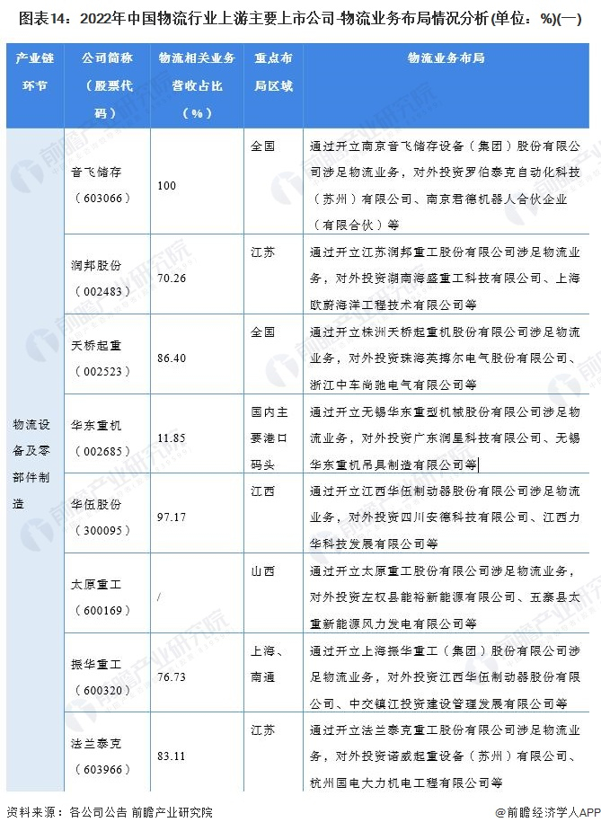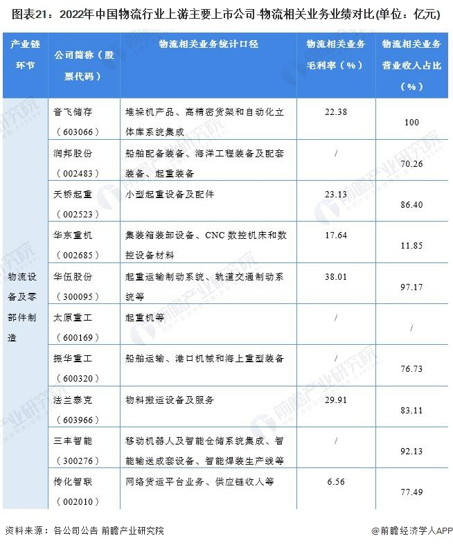 目前,我国物流行业上游主要上市公司有音飞储存、润邦股份、天桥起重、振华重工、华伍股份、法兰泰克和三丰智能等。其中,音飞储存、华伍股份和三丰智能物流相关业务营业收入占比较高,均达到92%以上。