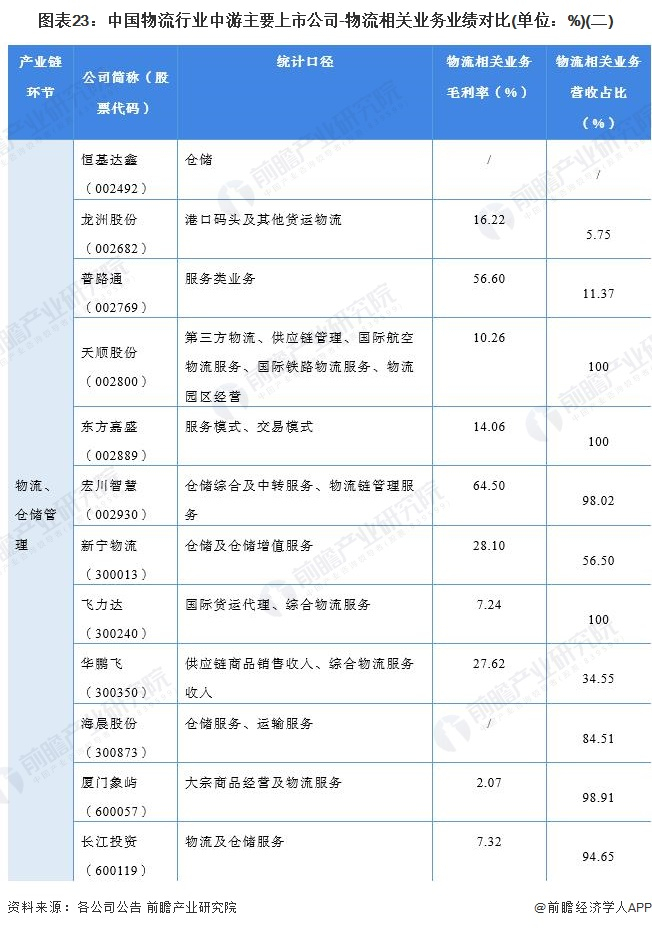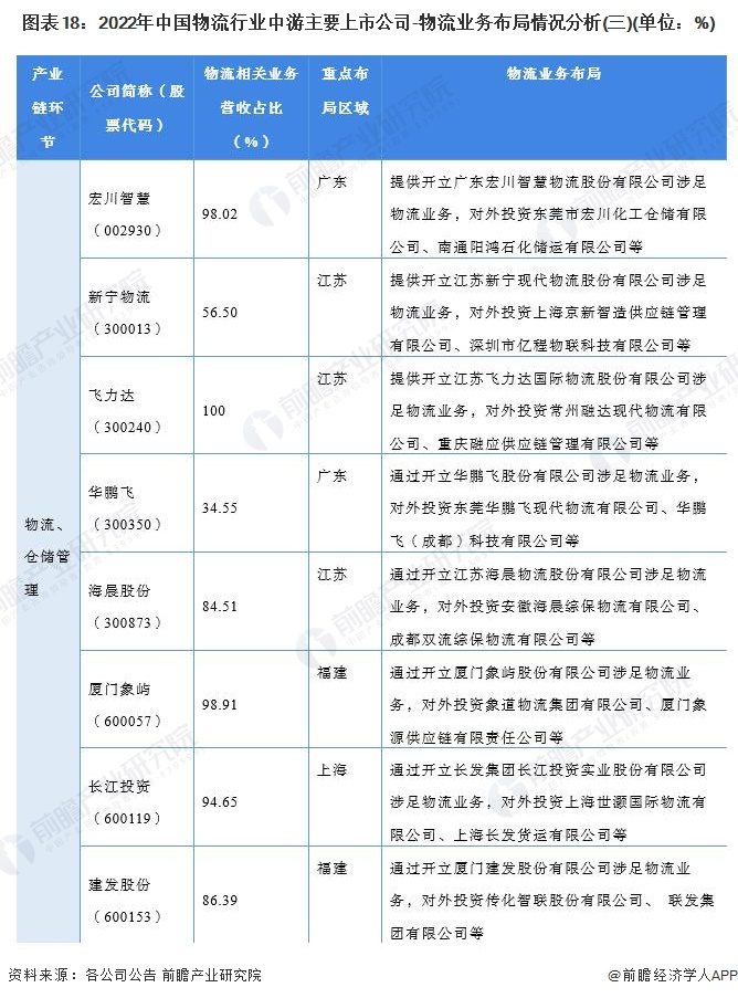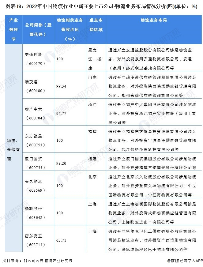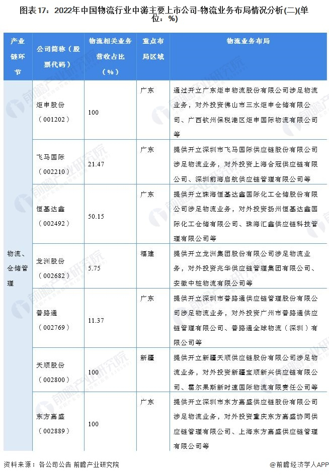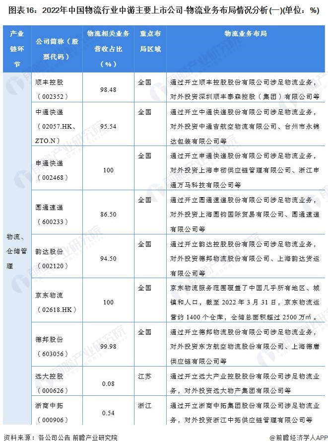 物流行业的上市公司中,顺丰控股、京东物流、圆通速递、申通快递、中通快递、韵达股份和德邦股份的物流业务布局最广,业务遍布全国各地。其他公司基本通过开设方式或投资(全资或部分出资)物流行业相关公司,参与物流业务的经营。