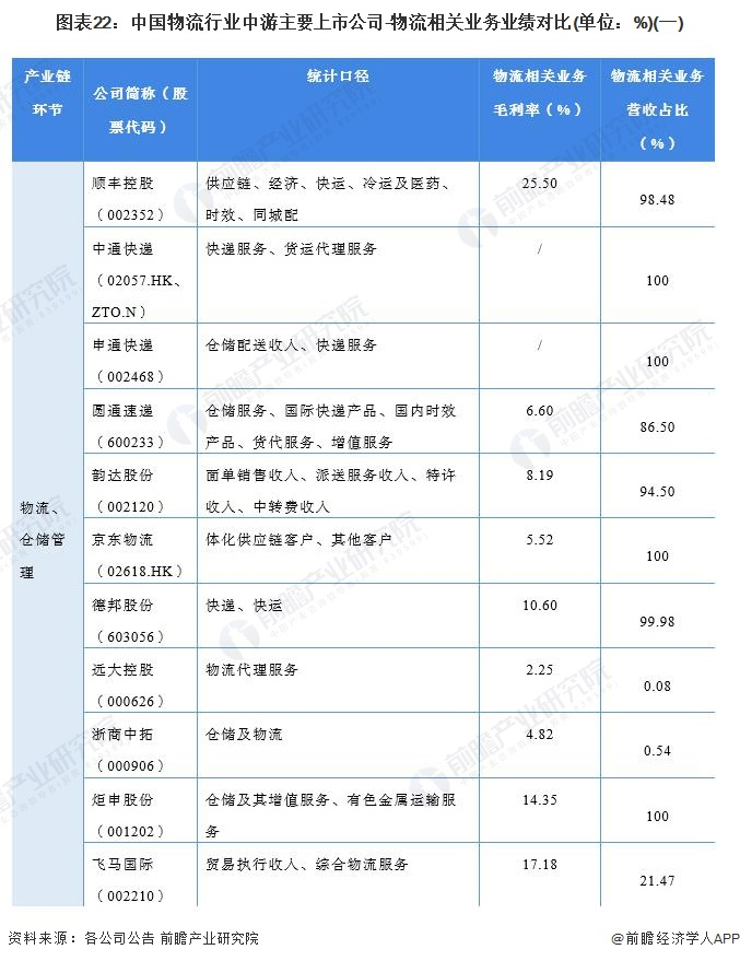 我国物流行业中游主要上市公司有顺丰控股、京东物流、圆通速递、申通快递、中通快递、韵达股份和德邦股份等。上述公司物流相关业务营业收入占比较高,均达到85%以上。