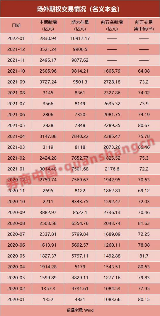根据中证协此前的数据,场外期权新增规模最大的5家券商,市占率普遍超60%,最高超80%。