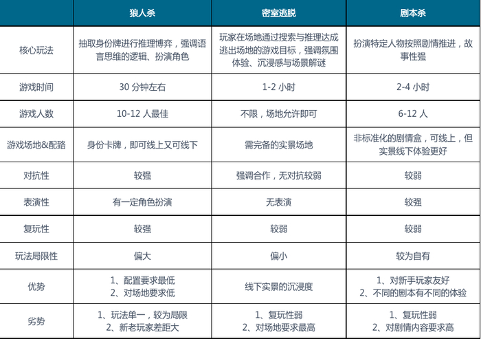 狼人杀、密室逃脱、剧本杀游戏特征对比