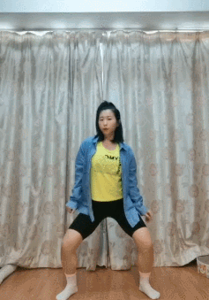 全程屈膝,前后位移,重心上下弹动,左右脚分别做上步+跟脚,同时手部向下拉,做“抓星星”的动作。紧接着做“踢键子”的动作,注意手脚不一定要相碰,做好上下弹动,保持身体框架及韵律感即可。