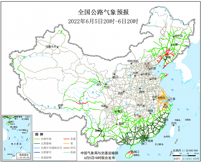 据“交通运输部”网站6日消息,6月5日20时至6日20时,湖南南部、江西南部、浙江南部、福建大部、广西南部和东部、广东大部及云南中部、辽宁中部等地部分地区有大到暴雨,其中,湖南南部、广西东北部、广东西北部、福建西部等地部分地区有大暴雨。辽宁大部、山东东部、海南北部、西藏东北部等地局地有雷暴。另外,江苏中南部、浙江中北部、安徽东部、湖南东部等地局地有雾。