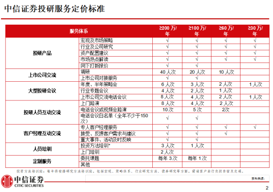 中信证券个人签约分为4个收费档次,根据年收费30万、60万、100万、200万的不同,上市公司交流、大型投研会议、投研人员互动交流、人员培训、定制服务的频次也各有不同。