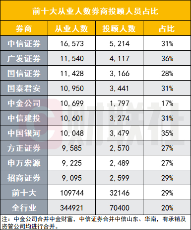 人员分布的马太效应也更加强烈。前十大券商的投顾人数占比已达到投顾总人数的46%,也就是说全行业近一半投顾都在前十大券商。其中,中信证券的投顾人数最多,为5214人,广发证券投顾占比最高,达到36%。
