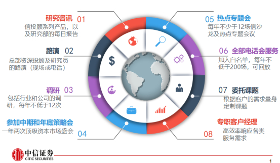 目前中信证券的付费投顾直接由总部研究所提供服务,签约后可享受总部研究资讯、路演、每年不低于12次的行业公司调研、中信策略会、热点沙龙专题、200场以上白名单电话会、定制课题、专职客户经理等8大服务。