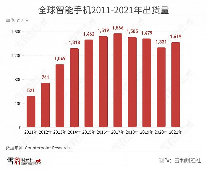 2020年,智能手机出货量降幅达到10%,2021年虽然同比微增6.6%,但14.19亿部的出货量仅达到2015年的水平。