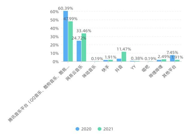 《2021中国音乐人报告》显示,2021年,腾讯音乐、网易云音乐两大数字音乐平台依然占据了音乐人获取平台收益的前两名,但其收益占比相比2020年均有不同程度的下降。不过2021年音乐人在抖音平台获得的收益增长迅猛,而在直播平台的收益情况,抖音也以43.82%的占比排名第一。