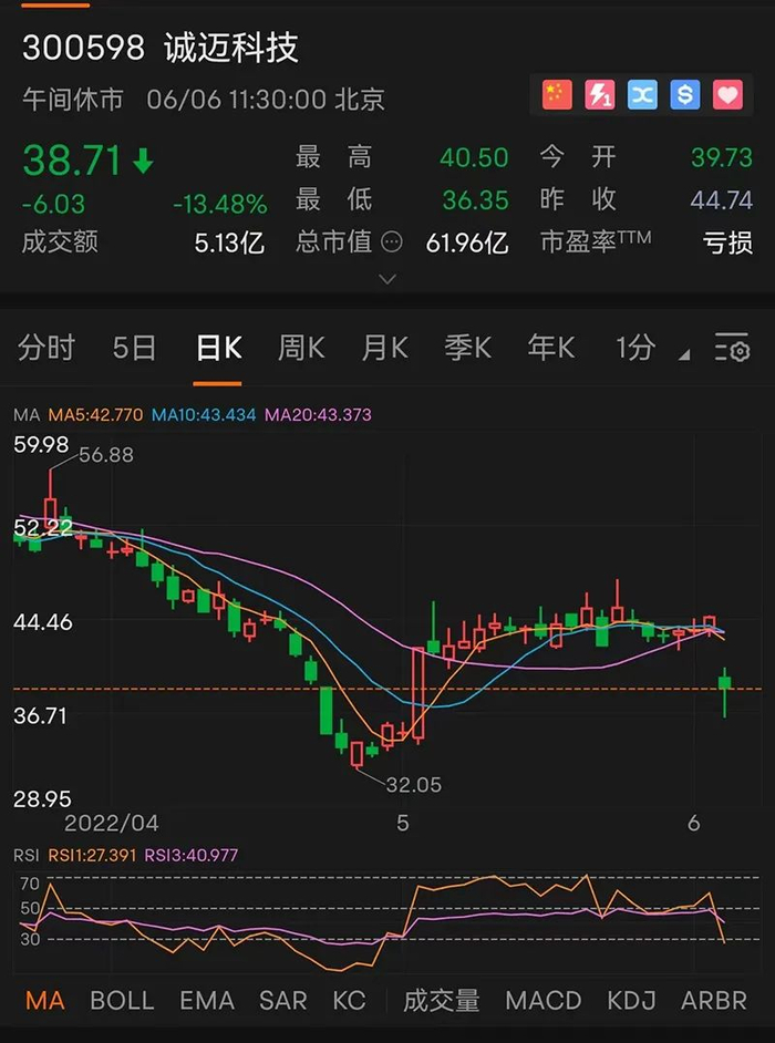 2021年6月,华为正式发布HarmonyOS 2及多款搭载HarmonyOS 2的新产品,鸿蒙正式从“备胎”转正,诚迈科技作为鸿蒙概念股遭到爆炒,股价在2个月实现翻倍,但随后整体呈震荡下行的趋势,并于今年4月27日创下32.05元的新低。