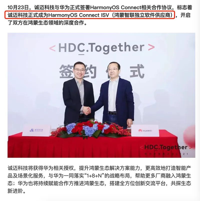 根据诚迈科技2021年年报,公司客户包括华为、vivo、荣耀、OPPO、小米等头部智能终端厂商,公司获得HarmonyOS Connect ISV(鸿蒙智联独立软件供应商)认证,成为HarmonyOS Connect ISV合作伙伴。