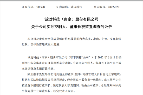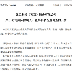 鸿蒙概念股诚迈科技(300598,SZ)6月6日早间公告,公司6月2日接到浙江省金华市金东区监察委员会通知,公司实际控制人、董事长王继平被立案调查及实施留置措施。根据相关法律法规及公司章程规定,经公司过半数董事一致推举,在王继平被留置不能履行董事长、法定代表人职责期间,暂由公司董事、总经理刘冰冰代为履行公司董事长、法定代表人职责。