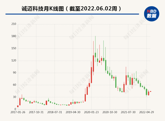 从股价表现上来看,2019年10月起诚迈科技股价开始飞速上涨,最高触及180元/股,市值接近290亿元,但随后整体呈震荡下行的趋势,并于今年4月27日创下32.05元的新低。