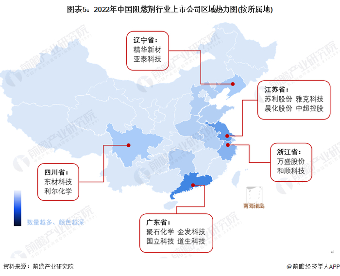 从区域分布来看,目前国内阻燃剂上市企业主要分布在长江三角洲和珠江三角洲等交通便捷、经济发达地区,尤其以江苏、广东和浙江为代表的省市集聚较多的阻燃剂上市企业。