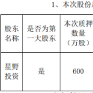 星徽股份控股股东星野投资质押600万股 用于提供担保