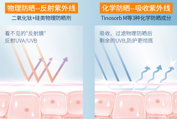 物化双重防晒,让防晒效果达到1+1>2的效果。