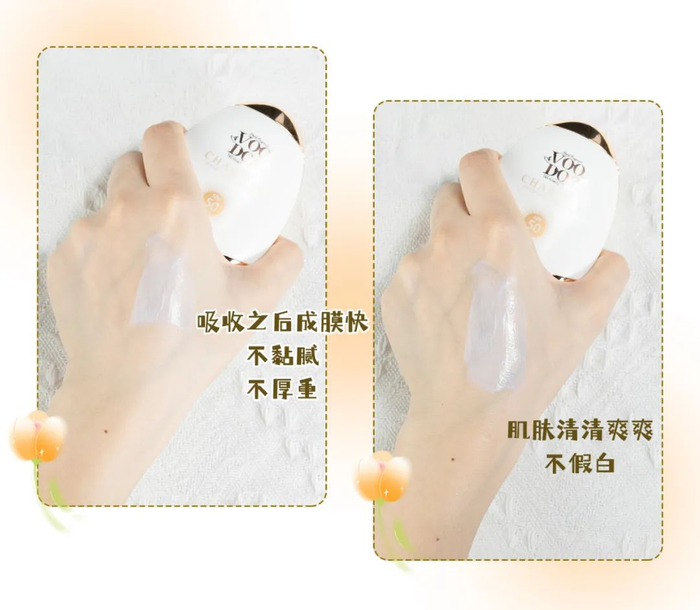 吸收之后成膜快,不黏腻、不厚重,涂了防晒霜的肌肤清清爽爽,仿佛皮肤在大口呼吸。