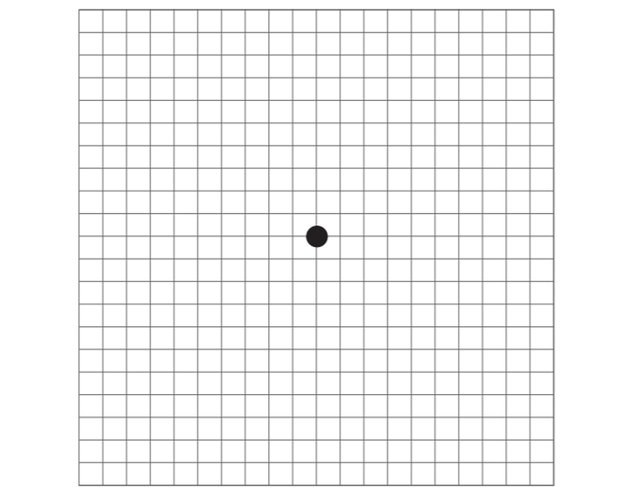 人的大脑会对眼睛看不见的部分进行补充,从而使人产生“看见”的错觉。因此在日常生活中,人们通常察觉不到自己看不见某些东西,注意不到视野中有缺损或映入眼帘的事物出现了弯曲等现象。用单眼看下面的图像可以测试是否存在黄斑水肿、黄斑前膜等一系列眼科疾病。检测方法非常简单,希望大家能够定期自我检测。若是在测试时看见了曲线,这说明视网膜上出现了增殖膜;如果出现了部分黑影,则可能是视网膜细胞或视神经出现了异常;如果视野中心存在缺损,那么很可能是黄斑(特别是中央凹)出现异常。