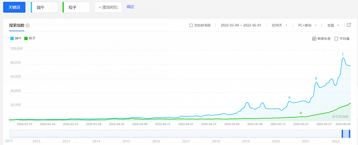 从社会关注度来看,微博渠道“端午节”的话题阅读量现已超过了81亿次,而在百度指数,明显可见随着时间逼近,人们会逐步加大对于节日的关注和期待,再从细节来看,粽子的热度比端午的热度要低,这意味着粽子并不全是端午营销的全部打开方式。