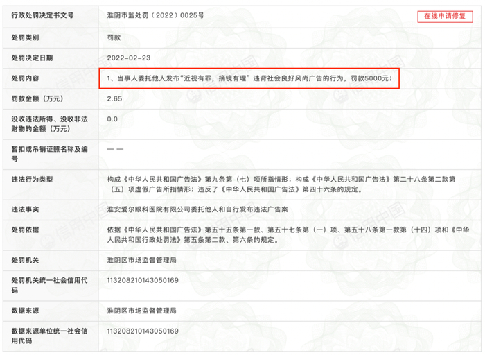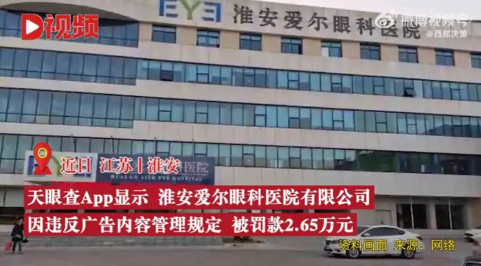 天眼查App显示,淮安爱尔眼科医院有限公司,因违反广告内容管理规定,被罚款2.65万元。处罚事由包括:发布未经审查批准的广告;用奥运击剑冠军仲满的代言图像误导消费者;配文“近视有罪,摘镜有理”对近视患者带有偏见、违背社会良好风尚。对此,不少网友表示匪夷所思,更有网友直接喊话“爱尔眼科先自医吧”。