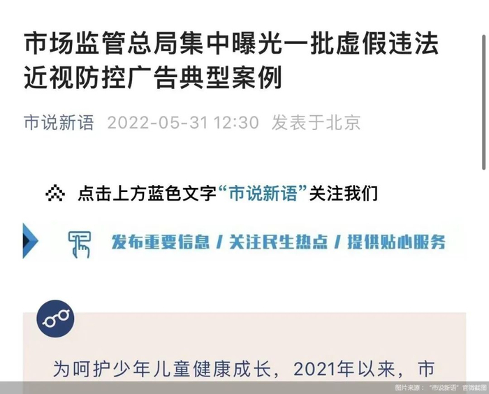 为呵护少年儿童健康成长,2021年以来,市场监管部门组织开展了儿童青少年近视防控产品违法违规商业营销宣传专项整治行动,严厉打击相关虚假违法广告。5月31日,国家市场监管总局选取已经办结的6件典型案例予以曝光。