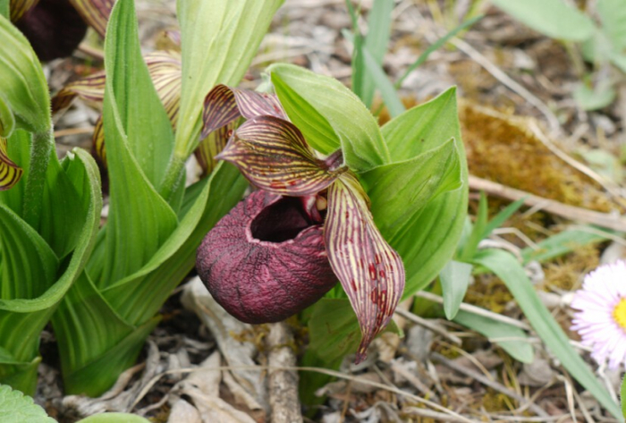 西藏杓兰,兰科杓兰属草本植物,主要生长在海拔2300米至4200米的透光林下、林缘、灌木坡地、草坡或乱石地上。广泛分布于我国西藏东部和南部,贵州西部、四川西部等地。西藏杓兰的花朵有3只萼片和花瓣,其中两只花瓣比较好辨识,还有1只花瓣呈口袋状(唇瓣),口袋上方有1只形似花瓣的萼片,后方还有两只合生在一起的萼片。这个大口袋,就像一个明目张胆的“陷阱”,专为吸引熊蜂前来传粉而准备。