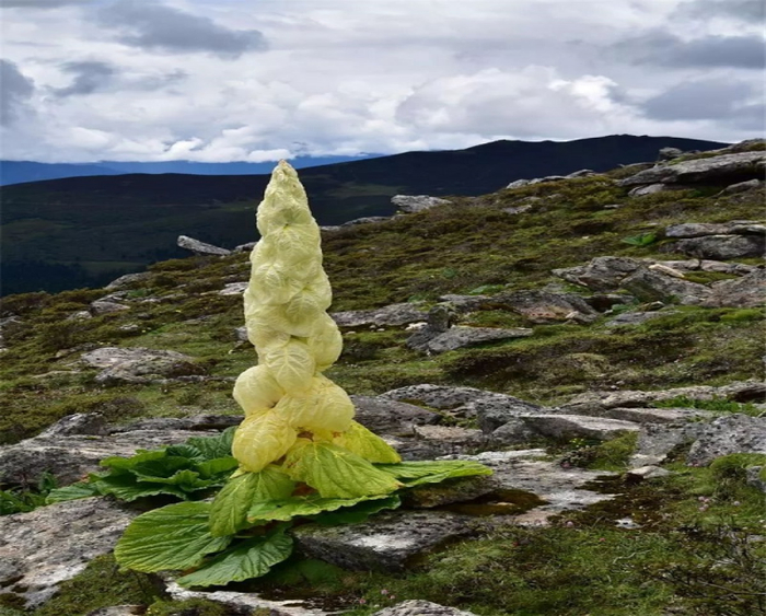 塔黄,也被称为高山大黄,蓼科,大黄属高大草本植物。主要分布在西藏喜马拉雅山麓及云南西北部,海拔4000米至4800米的高山石滩及湿草地。它的形态像塔一样,作为高海拔明星植物,观赏性极高,也是整个冰缘带植物里个头最高的植物,最高能长到1.5米至2米。塔黄的成长期比较长,种子生根萌芽,长出两片子叶,随后逐步积累养分,年复一年,生长期和休眠期不断交替,当主根积累的养分达到一定程度时,塔黄就会迎来成年时期。成年的那一年也是塔黄生命的最后一年,它可以快速生长,迅速拔高,两个月的时间就能长到一人多高,开花结果后,它的生命也将走向终结,完成一次漫长的生命轮回。