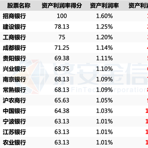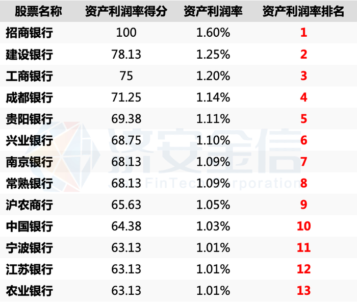 根据济安金信上市公司评价中心对2021年A股上市银行资产利润率的统计数据,共有13家A股上市银行的资产利润率超过1%。其中,招商银行以1.6%的资产利润率遥遥领先,夺得冠军,建设银行和工商银行分别以1.25%和1.20%的资产利润率位列第2和第3。工商银行、农业银行、中国银行、建设银行四大行的资产利润率均超过了1%,进入榜单。成都银行、贵阳银行、南京银行、宁波银行、江苏银行等城市商业银行2021年盈利状况良好。具体排行如下表所示。