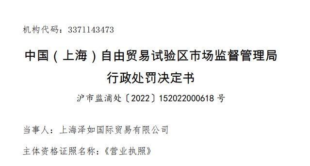 中国质量新闻网讯(闫冬)国家企业信用信息公示系统近日公布一则行政处罚信息。上海泽如国际贸易有限公司(以下简称:当事人)被中国(上海)自由贸易试验区市场监督管理局罚款6.5万元。