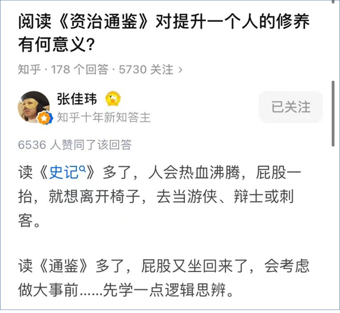作家张佳玮在知乎上回答了这个问题。他说:读《史记》多了,人会热血沸腾;读《通鉴》多了,会考虑做大事前......先学一点逻辑思辨。