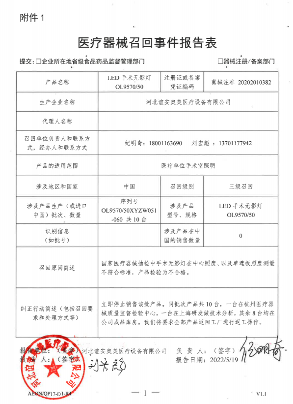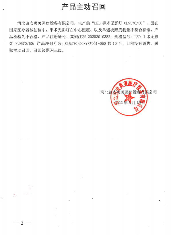 中国质量新闻网讯 近日从河北省药品监督管理局网站获悉,河北谊安奥美医疗设备有限公司主动召回部分LED手术无影灯。