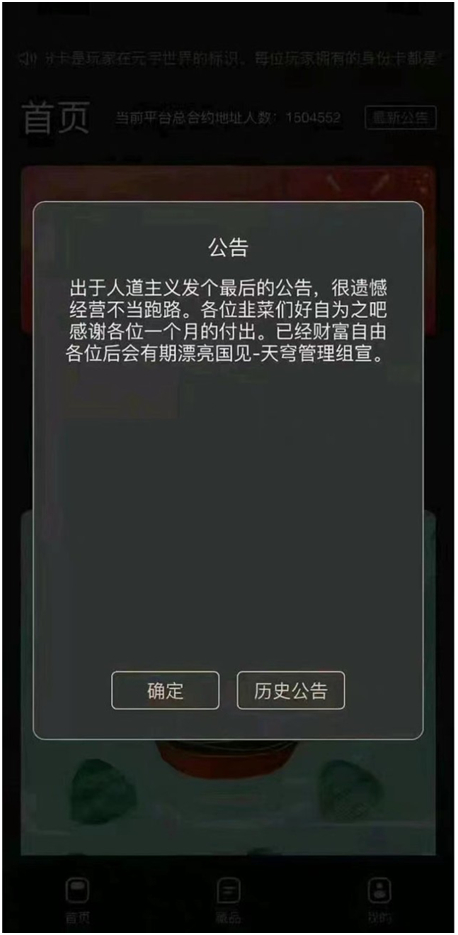 近日,一张关于天穹元宇宙数字藏品平台跑路的公告在网上流传。网传的所谓“最后公告”截图中称其因经营不善跑路,并将用户称为韭菜。