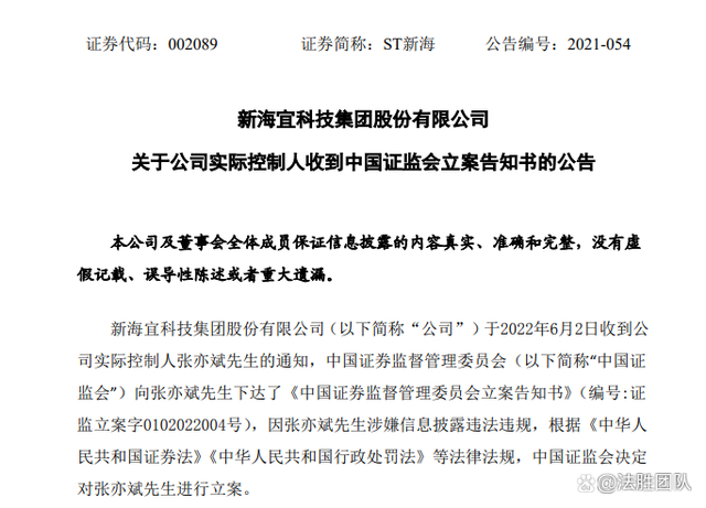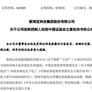 2022年6月3日,新海宜(002089)发布公告称,公司实际控制人张亦斌先生因涉嫌信息披露违法违规,收到《中国证券监督管理委员会立案告知书》(编号:证监立案字0102022004号)。公司将依照《深圳证券交易所股票上市规则》等相关规定及要求,对后续事项及时履行信息披露义务。