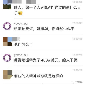 有群友调侃,一个A10、A11(身家10亿、百亿)也要借钱时,欧成效用姚振华举例称:据说姚振华为了400万美元,都给人下跪了。