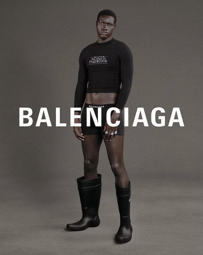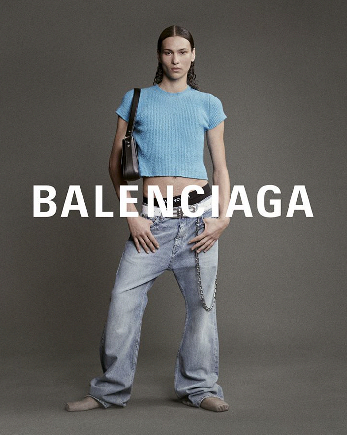 此次广告大片也展示了品牌的多款配饰单品,Balenciaga首饰、Excavator过膝长筒靴、Kensington芭蕾舞平底鞋、Falkon靴款,以及集迷你裙、长裤和靴子为一身、可拆解的五口袋三件套连靴裤。成衣系列成员还包括浴袍大衣、短腰剪裁上衣、做旧风衣、解构风格吊带裙、极紧身或极宽松的成衣单品。低腰裤则搭配双B搭扣腰带,内侧露出Balenciaga底裤的品牌徽标,极具辦识度。
