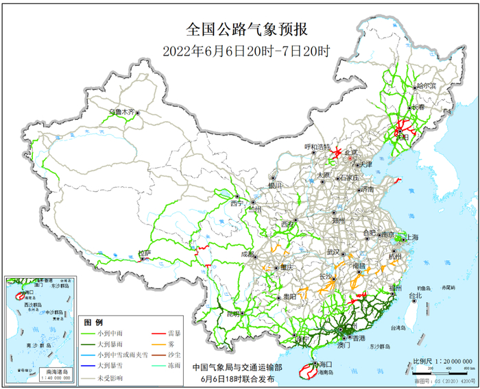 6月6日20时至7日20时,江西南部、广西东南部、广东、福建中南部、海南岛以及云南中西部等地有大到暴雨,其中,广东东部沿海、福建西南部等地部分地区有大暴雨。河北西北部、辽宁北部、山东东北部、江西南部、海南岛大部、西藏东部等地局地有雷暴。另外,浙江中部、江西中北部、湖北东南部、湖南中北部、四川盆地中东部、贵州东部等地局地有雾。