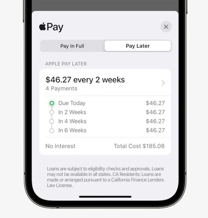 用户在交易发生后,可支付部分款项,类似购房款项中的首付,然而每两周偿还部分剩余欠款,全部还款都在苹果钱包应用中进行管理,当然也允许提前还款。