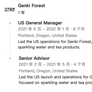 Bliss Dake,现任俄勒冈州一家名为True Terpenes的市场VP,曾经在2021年2月到2022年1月负责元气森林在美国的上线和运营。