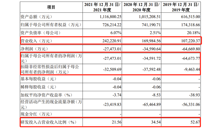 财务数据方面,根据招股书,2019年-2021年(下称:报告期),诚瑞光学实现营收分别为10.72亿元、17亿元、24.22亿元,同期归母公司净利润分别为-6.47亿元、-3.46亿元、-2.75亿元;扣非后净利润分别为-9,463.44万元、-3.76亿元、-3.25亿元。