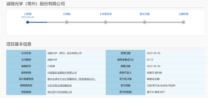 中华网财经了解到,近日,诚瑞光学(常州)股份有限公司(下称:诚瑞光学)科创板IPO获上交所受理,拟募资82.10亿元,中金公司为保荐机构,据悉,诚瑞光学为香港联交所主板上市公司瑞声科技控股子公司。诚瑞光学本次拟发行不超过 1,692,220,000 股,不低于本次发行后总股本的10%,不超过本次发行后总股本的 20%;