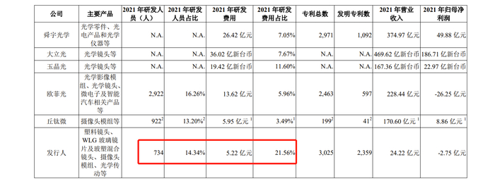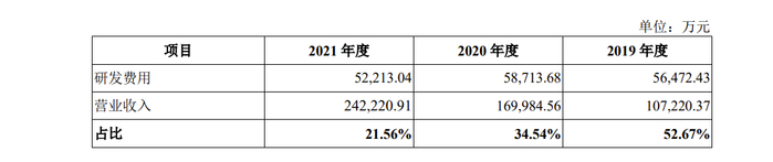 2019-2021年,诚瑞光学研发费用分别为5.65亿元、5.87亿元、5.22亿元,研发费用占营业收入比分别为52.67%、34.54%、21.56%,呈现逐年下降趋势。